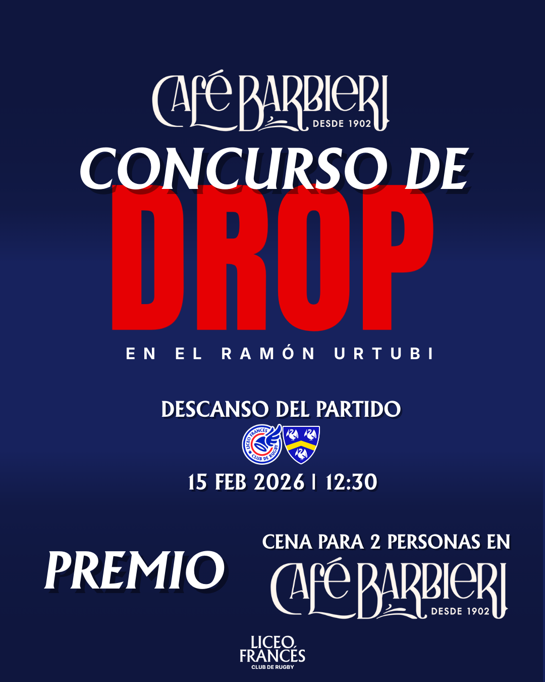 En el descanso del encuentro celebraremos el Concurso de Drop Café Barbieri, una iniciativa que busca fomentar la participación de nuestras aficiones, disfrutar del rugby desde otra perspectiva y vivir un momento entretenido en familia y con amigos.